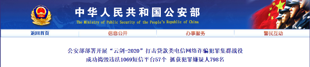 根据中华人民共和国公安部网站信息,2020年5月7日上午10时,随着公安部一声令下,全国公安机关“云剑-2020”打击贷款类电信网络诈骗犯罪集群战役正式打响,北京、河北、上海、江苏等15个省市公安机关同步开展集中收网行动。截至7日15时,各地共捣毁为贷款类电信网络诈骗犯罪团伙提供服务的违法1069短信平台57个,抓获犯罪嫌疑人798名,扣押手机、银行卡、电脑等一大批涉案工具。